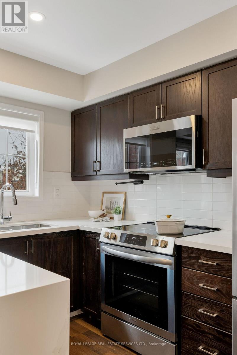 A Luxurious 2-Bedroom Fernbrook Condo awaits in Uptown Core, Oakville. Positioned in the heart of Oakvilles sought-after Uptown Core, this stunning 2-bedroom Fernbrook condominium has the perfect blend of modern elegance & urban convenience. Within walking distance to shopping, restaurants, & essential services, & just minutes from Oakville Hospital, major highways, & public transit, this prime location ensures effortless connectivity. The beautifully maintained complex grounds feature a serene central courtyard, lush gardens, & picturesque walking paths, while nearby ponds, scenic trails, & ravines invite exploration & outdoor enjoyment. Step inside this spacious & sunlit suite, where large windows flood the space with natural light, complementing the rich dark laminate flooring & designer marble-look tiles. The sophisticated oak staircase with wrought-iron pickets adds a touch of timeless elegance. The open-concept living & dining area is perfect for entertaining or unwinding after a long day, with garden doors leading to a private balcony overlooking the tranquil courtyard. The modern kitchen is a chefs delight, featuring quartz countertops, dark-stained cabinetry, pot lighting, & deluxe stainless steel appliances. Upstairs, the primary bedroom provides a peaceful retreat, sharing a beautifully appointed 4-piece bathroom with the second bedroom. A convenient upper-level laundry area adds to the homes practicality. With its stylish finishes, prime location, & inviting ambiance, this exceptional Oakville condo offers a rare opportunity to experience refined living in Uptown Core. (id:56590)