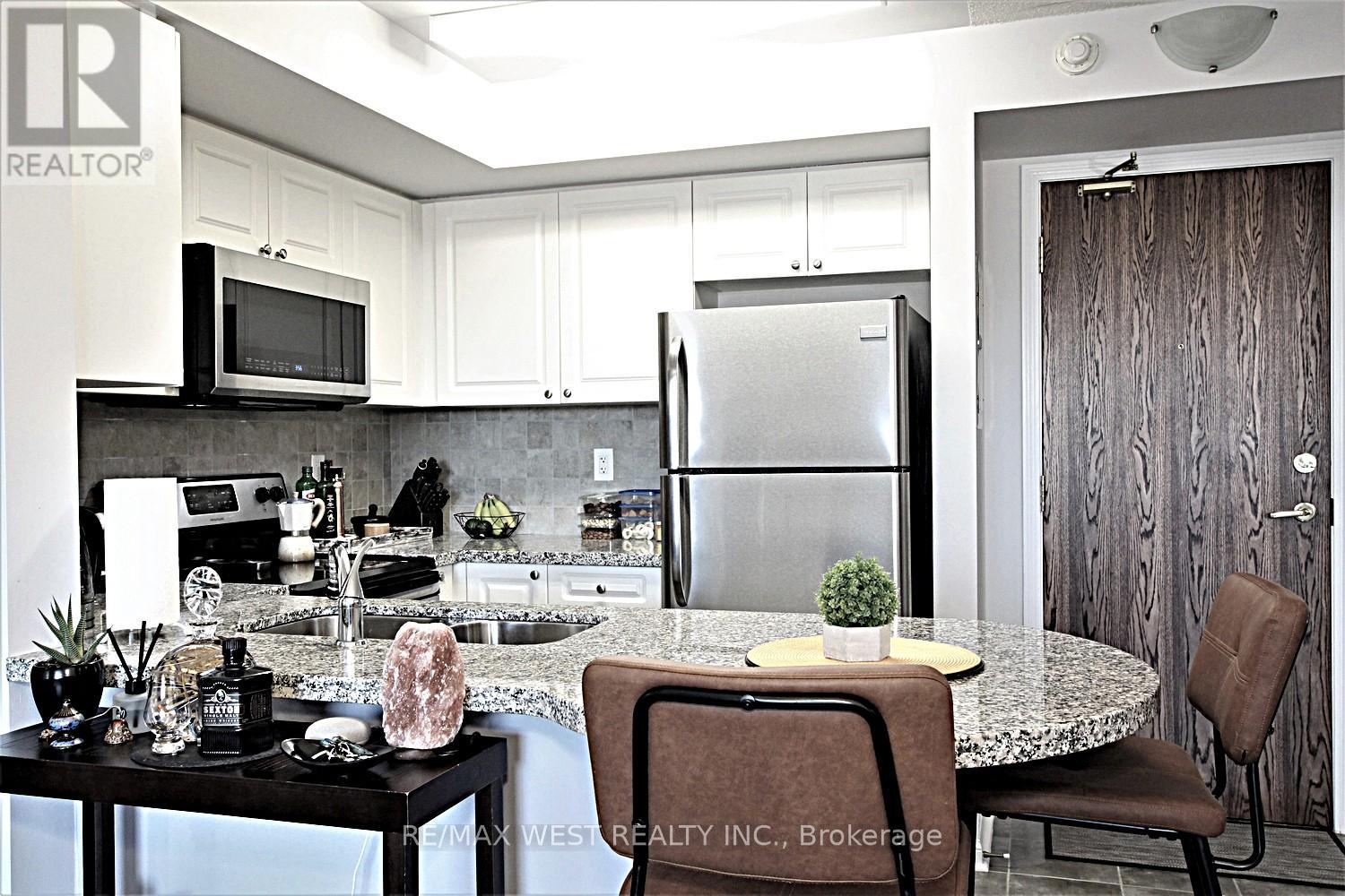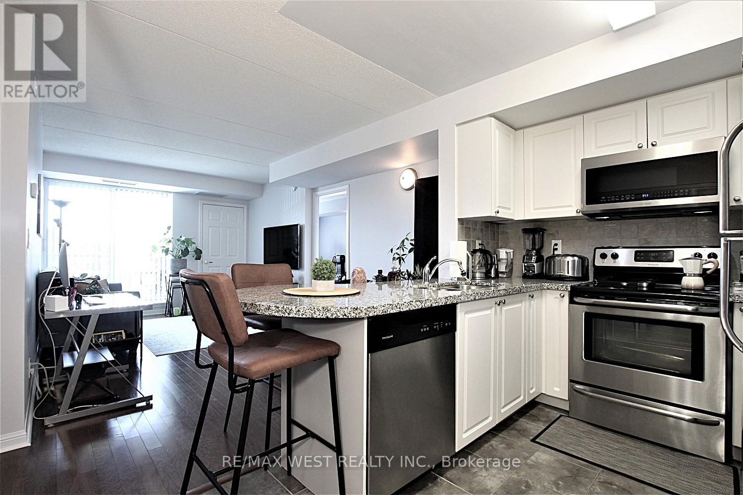 Welcome to the Chamberlain at Rosedale Village, a gated condominium community known for its well-maintained grounds and extensive amenities. This sun-filled two-bedroom suite offers a practical split floor plan with bedrooms on opposite sides, a long north-facing balcony, a generous living area, and a kitchen with granite countertops and a breakfast bar. The living and dining area features laminate flooring, with ceramic flooring in the foyer, kitchen, and bathroom. The primary bedroom is spacious, and both the living room and primary bedroom include sliding glass doors to the balcony. One underground parking space and a storage locker are included in the rent. Rosedale Village offers exceptional amenities, including a 9-hole golf course, tennis courts, shuffleboard, lawn bowling, numerous parkettes, and a clubhouse with an indoor pool, sauna, exercise room, lounge, party room, and an auditorium. A 24-hour gatehouse provides controlled access for residents and guests. This condo building is convenient to shopping, Highway 410, Heart Lake Conservation Park, and exceptionally long walking, cycling, and jogging trails throughout the Etobicoke Creek Trail system. Please note that the photos were taken when the condo was previously occupied by the owner. (id:56590)